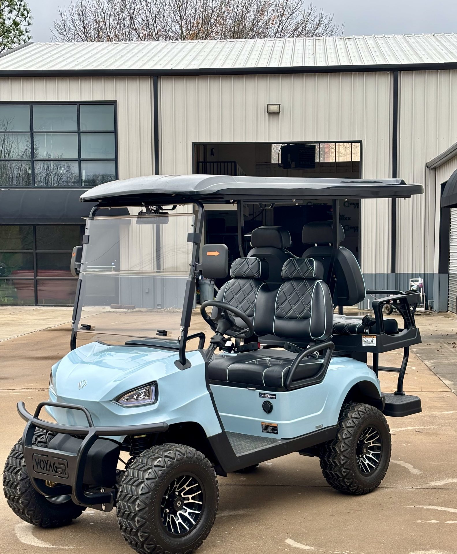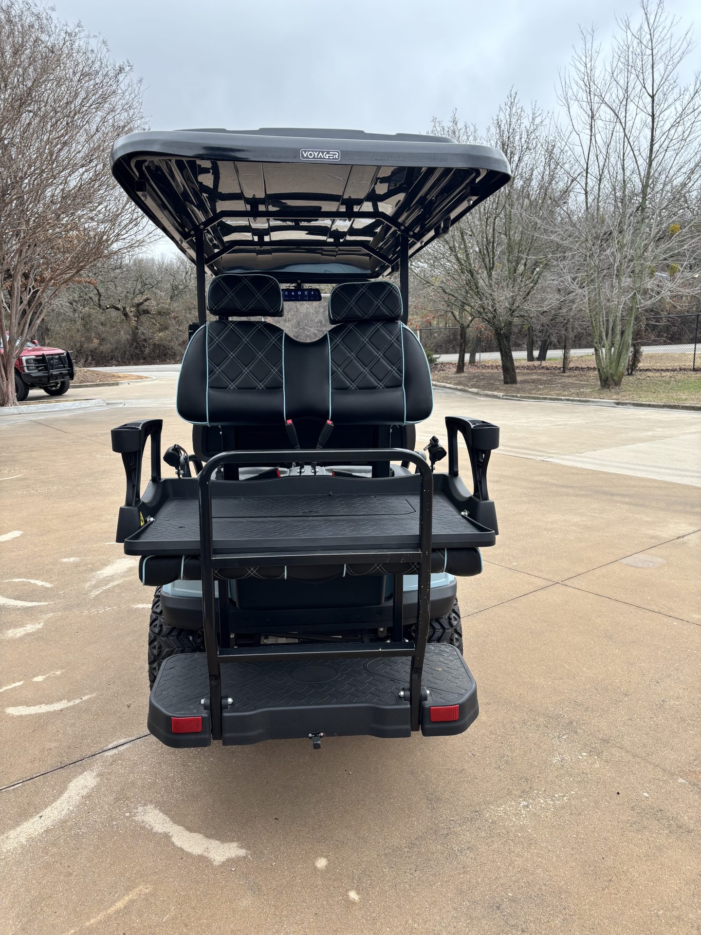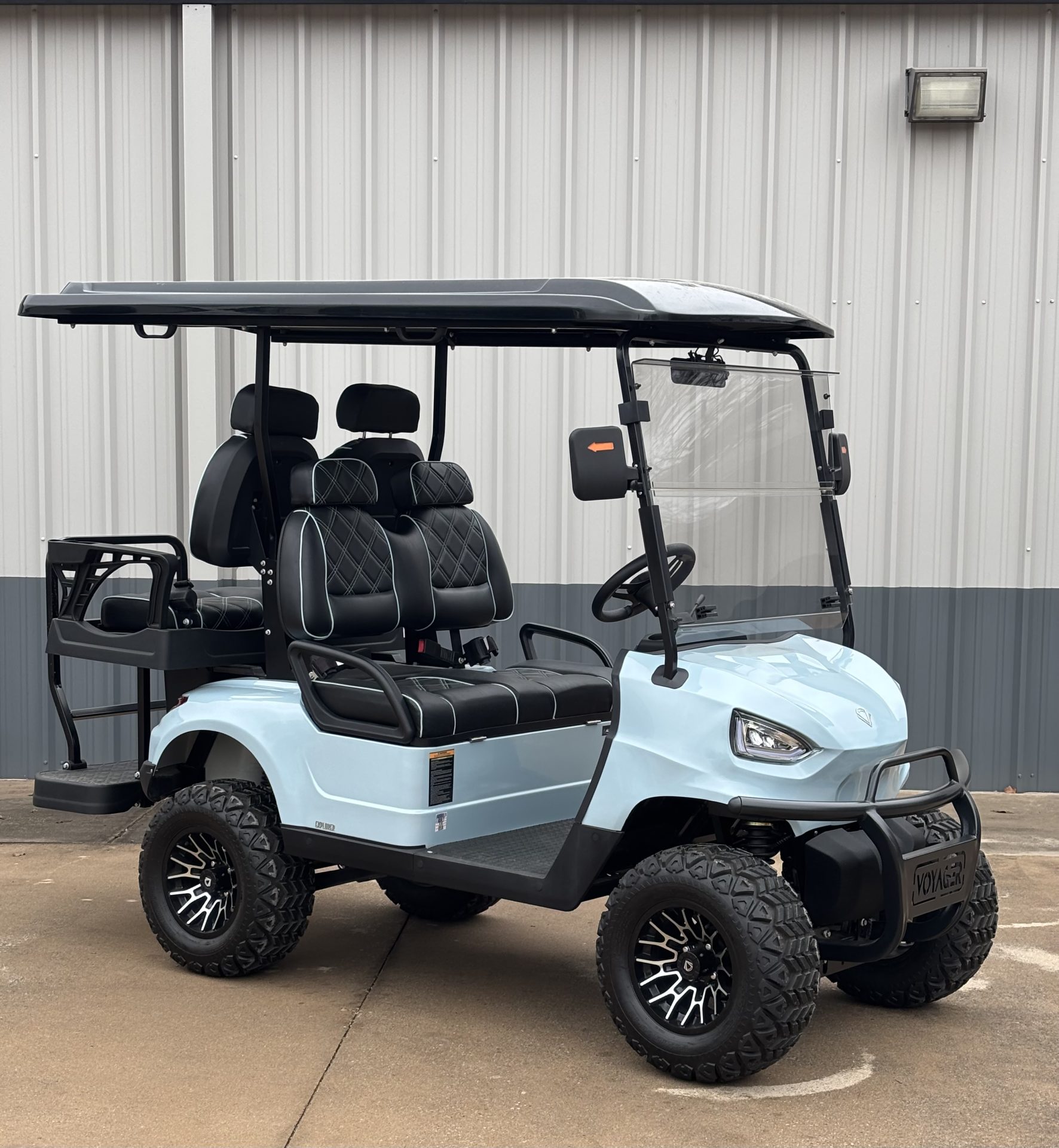 Voyager Explorer 4-Passenger Lifted Cart features: 2-Year Full Coverage Warranty (includes Parts AND Labor) Allied Lithium 48V + 105Amp-hour Batteries (includes 8-year manufacturer's warranty) Premium Metallic or Matte Paint Color Premium Contoured Hand-Stitched Seats 12" Wheel Packages Gussi Custom Steering Wheel Multimedia Sound System Reverse Camera Ice Chest/Insulated Storage Storage in Dash Onboard Charger for easy access and maintenance AC Power for Increased Torque Brush Guard Side Mirrors with Turn Signals USB Port Retractable Seatbelts Flip Down Rear Seat with Cupholders Turn Signal + Horn + Brake Lights LED Head & Tail Lights Spacious & ergonomic body/seating style