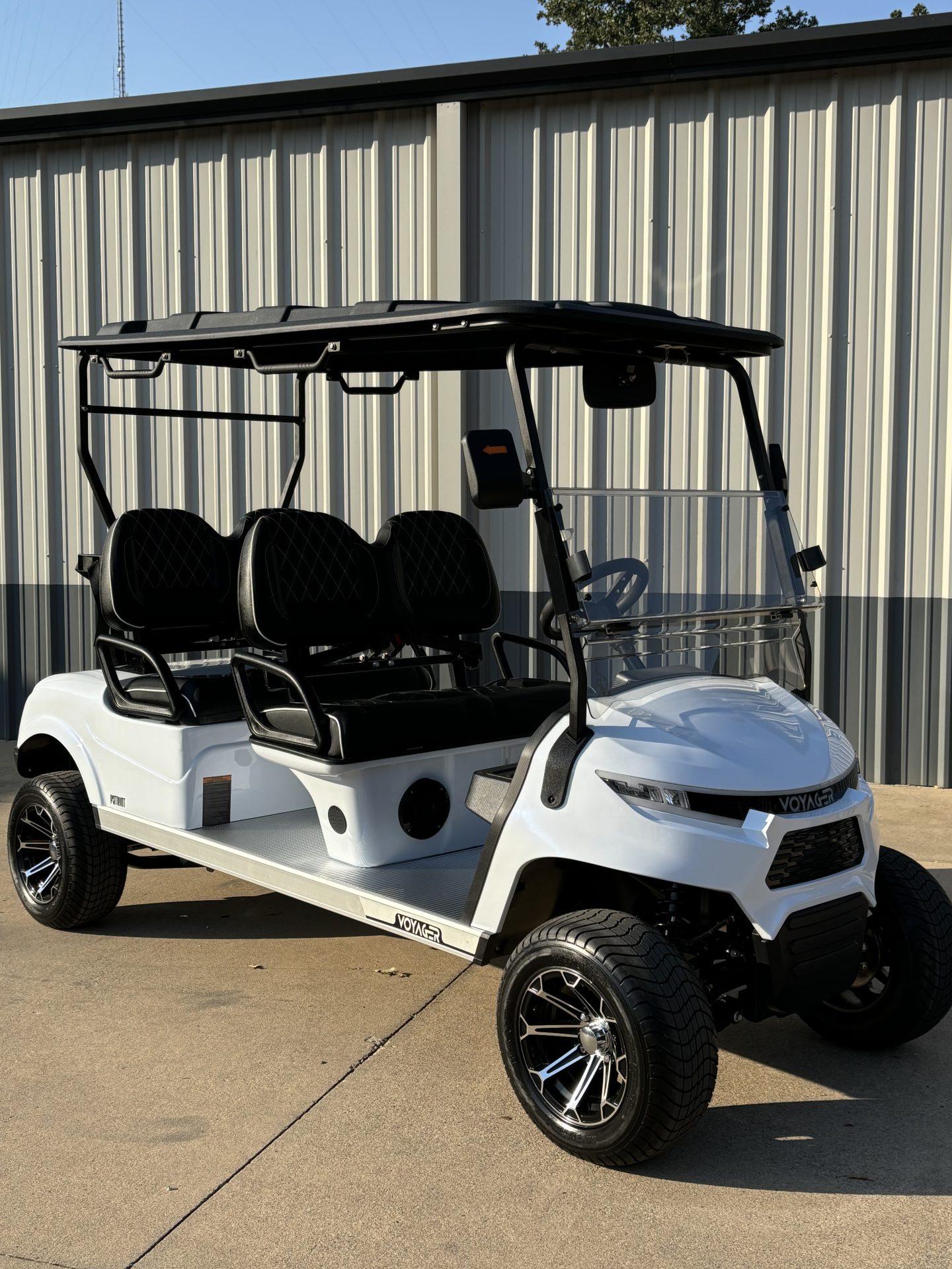 The Voyager Patriot is LUXURY! This Lifted 4-Passenger forward golf cart includes 72 volt-105 amp hour ECO Lithium Batteries.